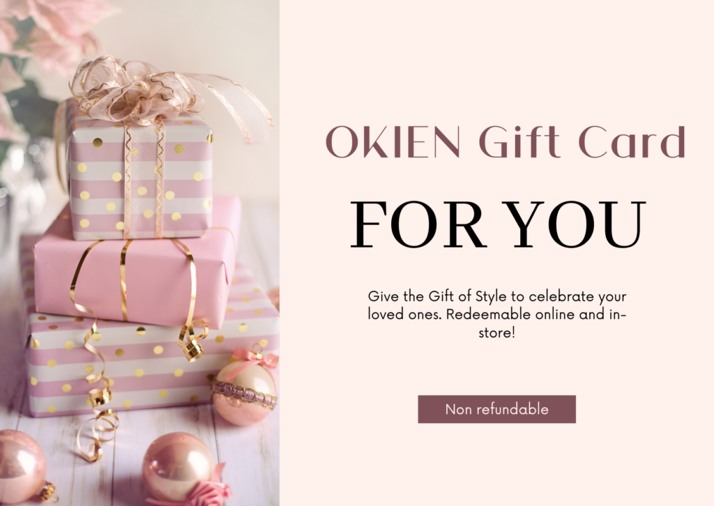Give the gift of style! OKIEN gift cards let your loved ones choose from our latest collections — perfect for birthdays, celebrations, or just because. Easy to send, redeemable online or in-store, and always stylish.