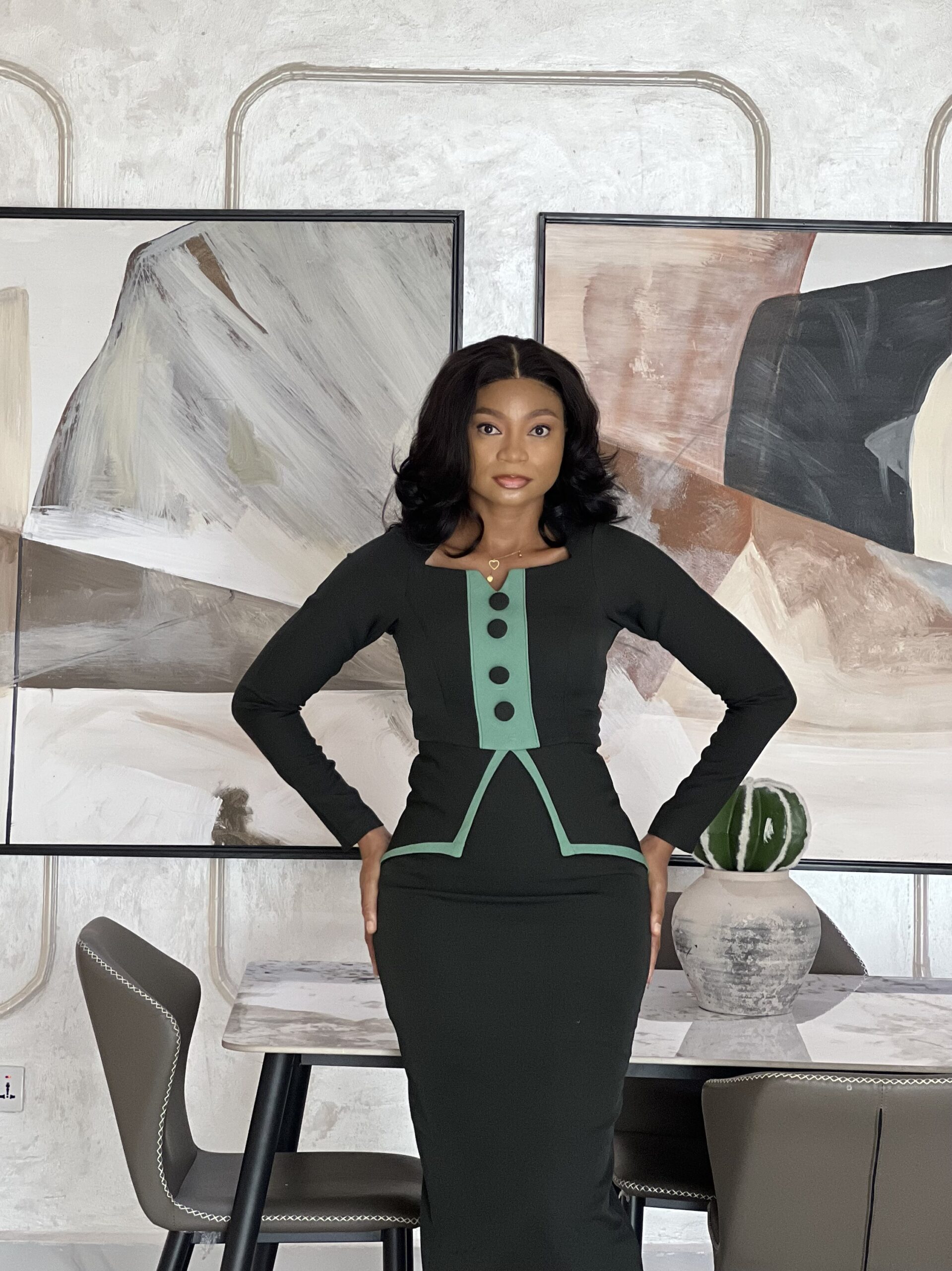 Osas is a mixture of Black and Pistachio Green. You love our button dresses so much that we decided to enhance the dress with Black cover buttons.
